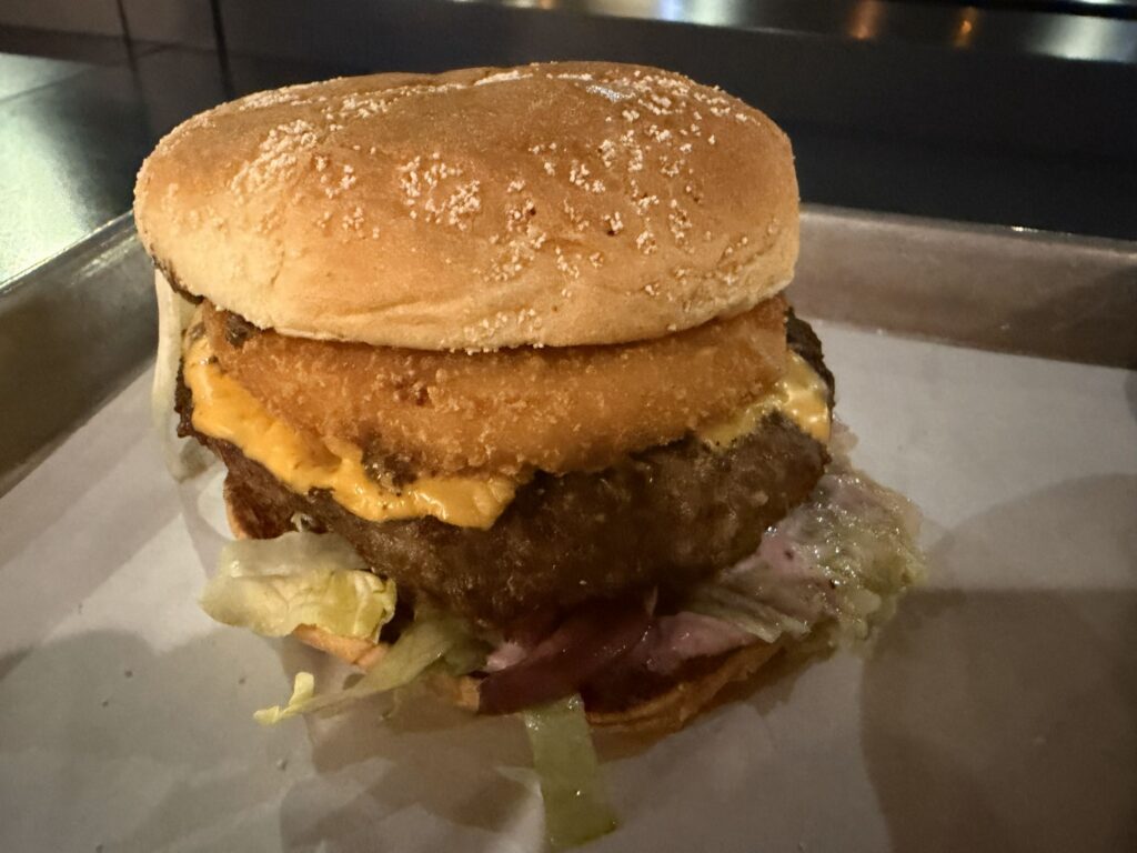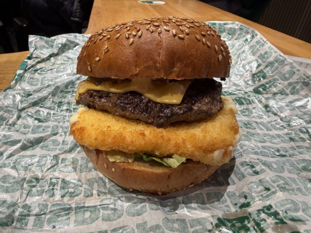 Co to za kanapka? „Połączenie wyśmienitego kotleta wołowego, panierowanego kotleta serowego i chrupiącego boczku podkręcone wyrazistym sosem chrzanowym. Podane ze świeżą sałatą lodową, prażoną cebulką oraz sosem z przyprawami w puszystej serowo-bekonowej bułce.”