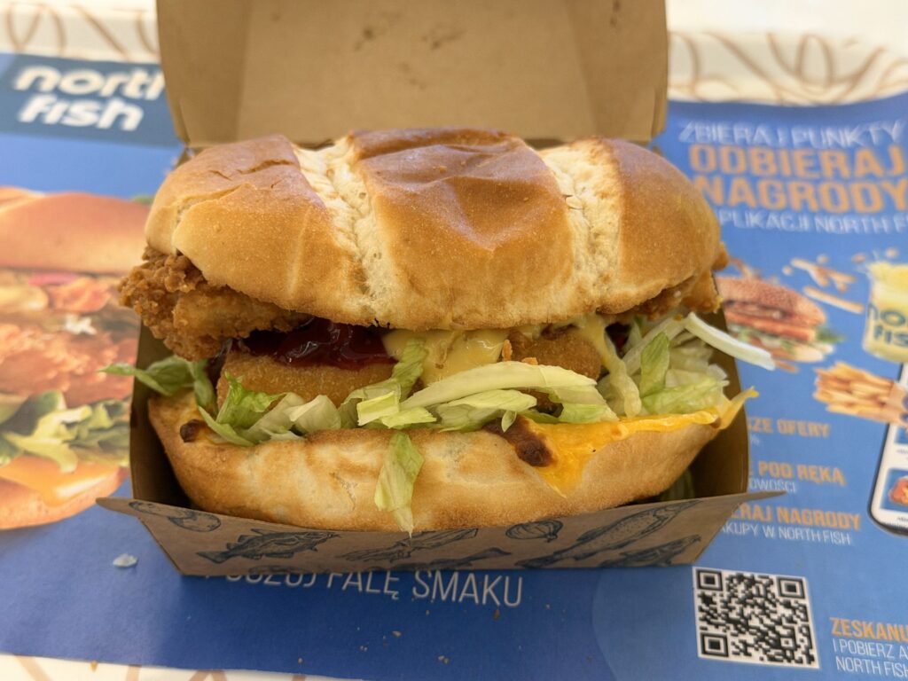 North Fish to polska sieć serwująca fast foody z rybą. W tym roku do swojej oferty dodali Burger Rybaka z żurawiną, czyli ich kanapkę sezonową z serem w panerce. Niestety bardzo słabo to smakuje. Żurawina zupełnie nie pasuje do ryby, przynajmniej wg mnie. Dlatego też ta kanapka okazała się jedną z najgorszych.