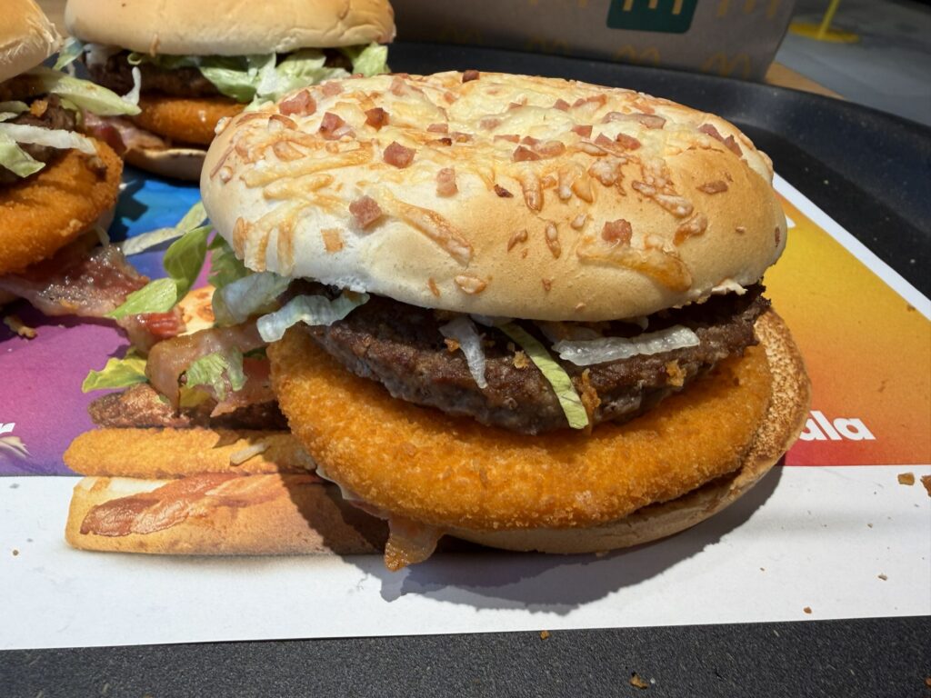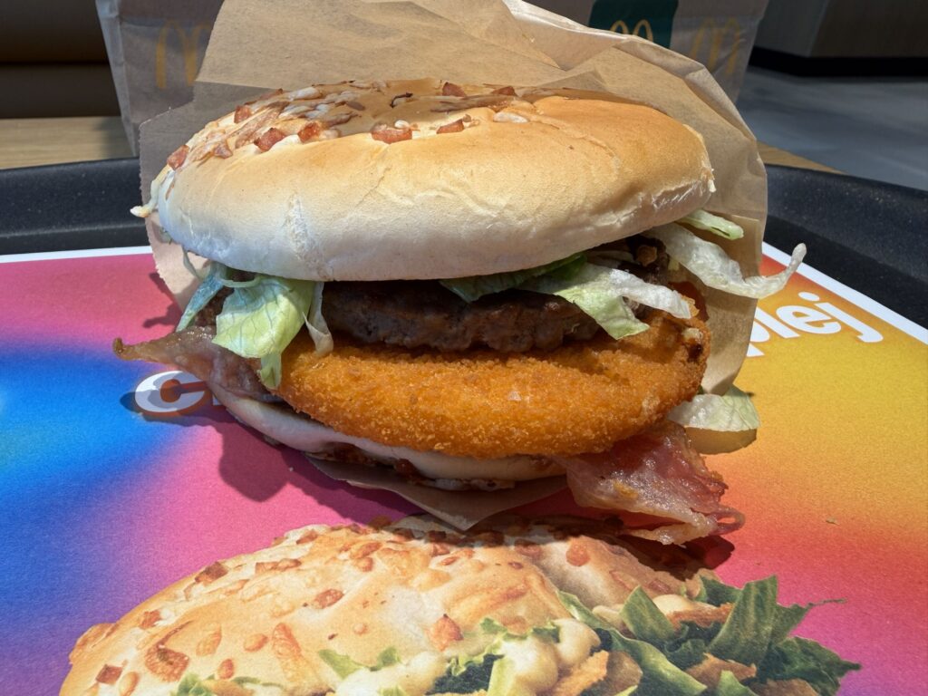 Co to za kanapka? „Soczysty kotlet wołowy, panierowany kotlet serowy i chrupiący boczek smakują jeszcze lepiej w towarzystwie wyjątkowego sosu żurawinowego. Do tego chrupiąca sałata lodowa, prażona cebulka, sos z przyprawami, puszysta serowo-bekonowa bułka.”