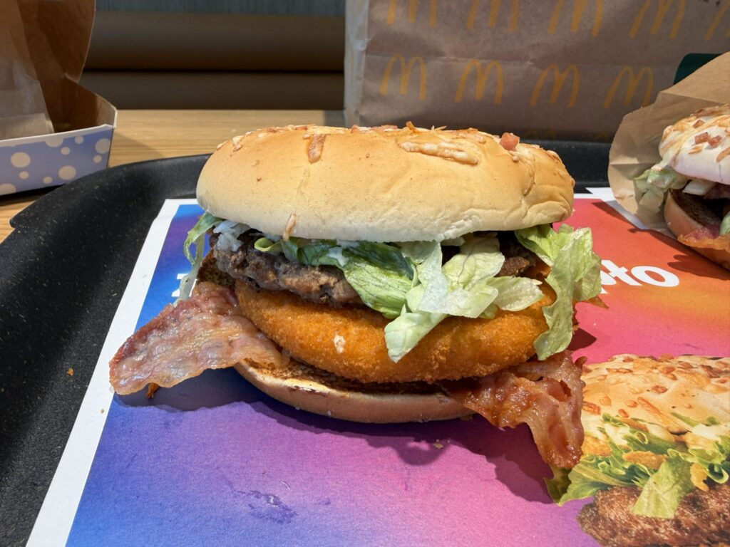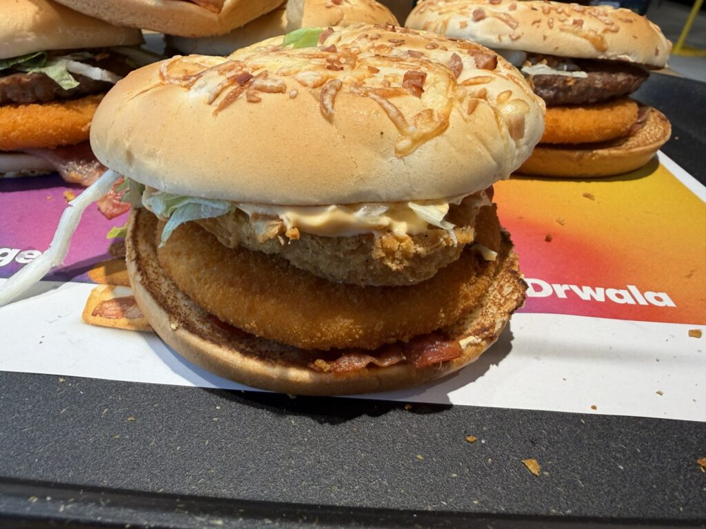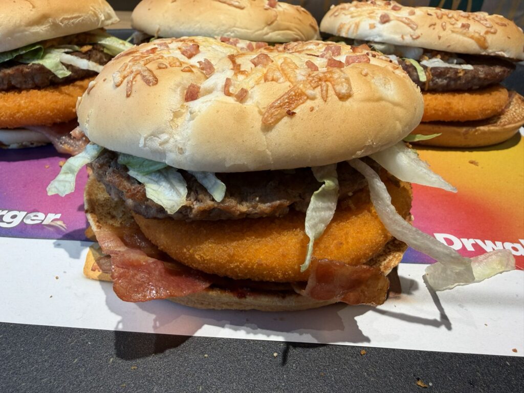 Co to za kanapka? „Wyśmienity kotlet wołowy, panierowany kotlet serowy i chrupiący boczek. Do tego idealnie dobrane dodatki: świeża sałata lodowa, aromatyczna prażona cebulka i sos z przyprawami. Całość zamknięta w puszystej serowo-bekonowej bułce.”