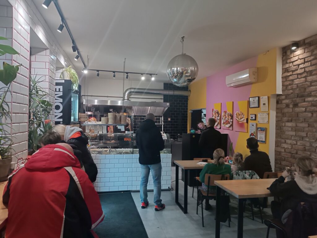 Sam lokal jest bardzo klimatyczny, ale niewielki. Znajdują się w nim 3 stoliki na maksymalnie 6 osób oraz około 6 krzeseł barowych przy oknie i ladzie, gdzie można zjeść posiłek. Nie jest to dużo, bo gdy raz byłem tam w środku, wszystkie miejsca były zajęte, a ponad 10 osób czekało na swoje zamówienia.